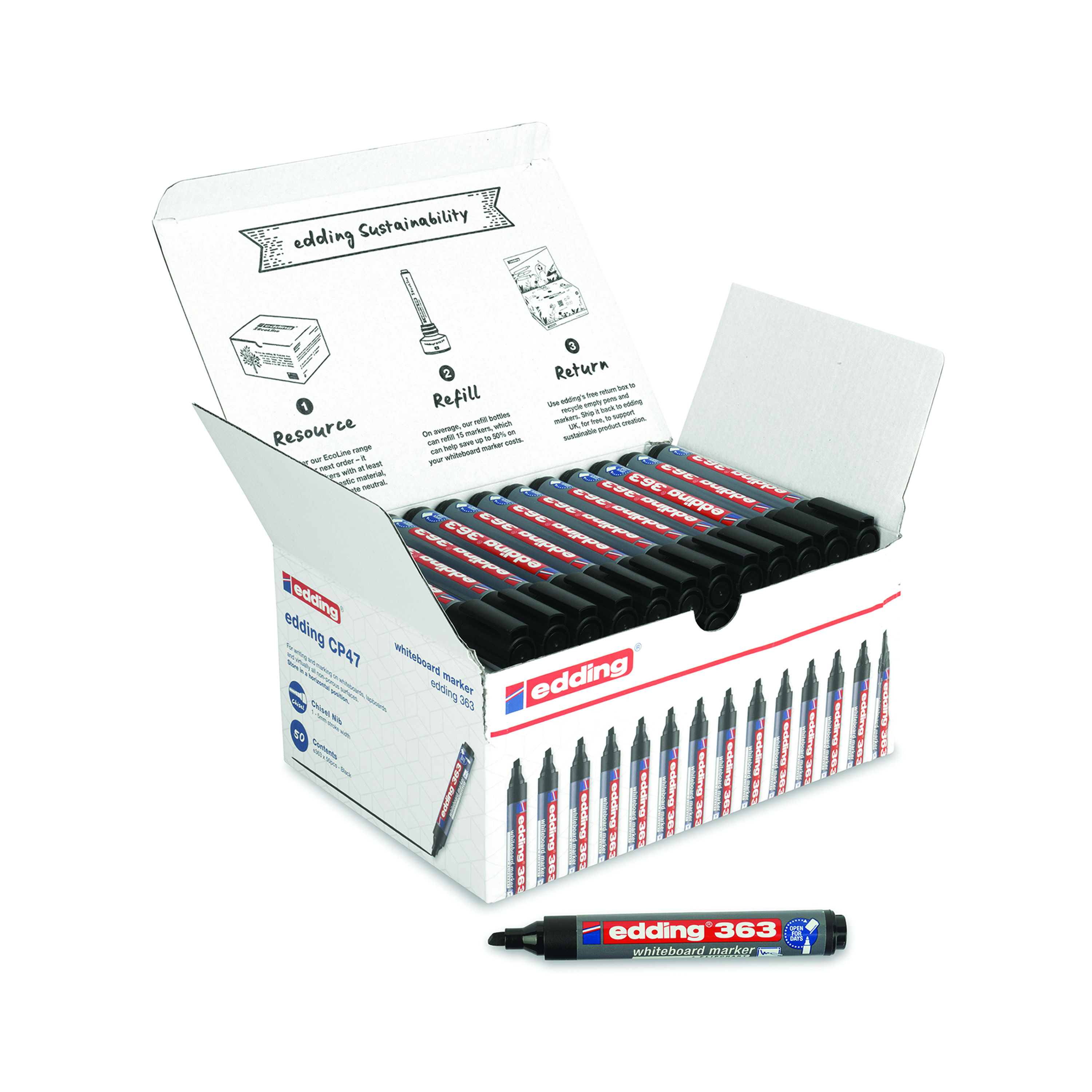 The edding 363 Whiteboard Marker Pens are a premium option designed for use in schools, offices or the home. With an unbeatable cap-off life and suited to a variety of surfaces including whiteboards and glass, this value pack of 50 markers is economical without compromising on quality. The low odour, quick drying, black ink is refillable.